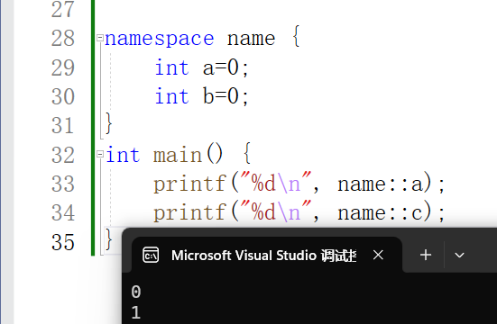 全局a=0而局部a=1,结果a=1表明访问的是局部变量a=1。如果我们想访问全局变量该怎么办呢?这时就要用到域操作符: