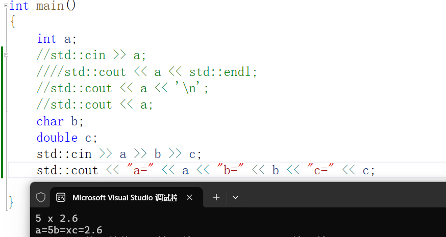 我们可以看到,在我们使用cin与cout时,不用在意a,b,c的类型,它会自动识别类型并执行相应的操作。