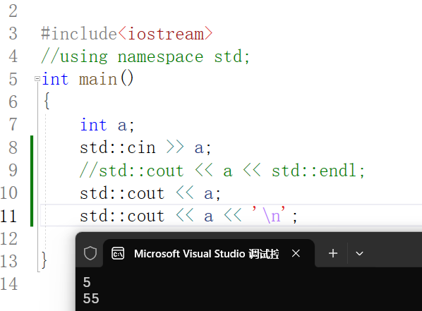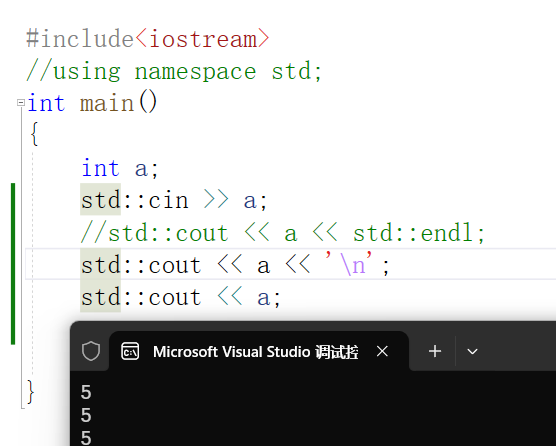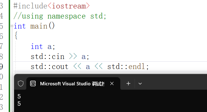 接下来我们看到示例中的命名空间展开 using namespace std; 上面我们提到了的C++标准库,而库中的函数都在一个名为 std 的空间里面,如果我们想要调用std内部的函数,则需要参考命名空间的用法(前面一起博客有详细讲解),接下来给个不用命名空间展开的示例。
