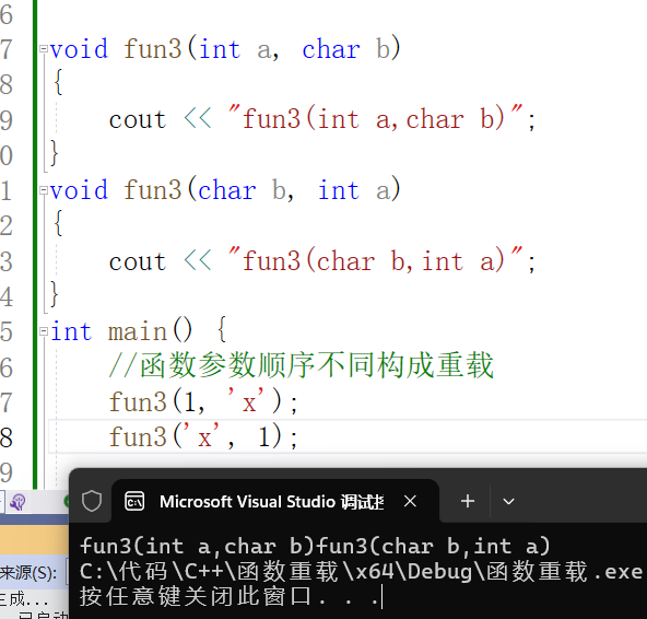 可以看到,同名函数参数类型相同,顺序不同依然可以构成重载。