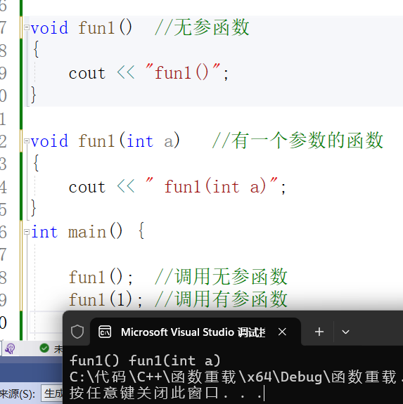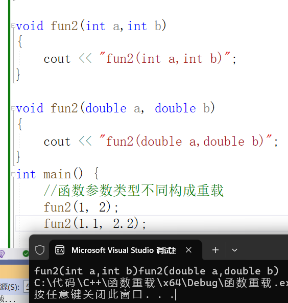 可以看到,我们构造的函数 fun2 ,一个参数类型为 int 一个为 double ,构成重载函数正常运行。