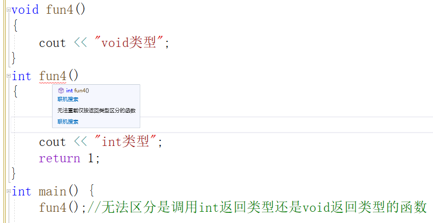 //fun4();//无法区分是调用int返回类型还是void返回类型的函数