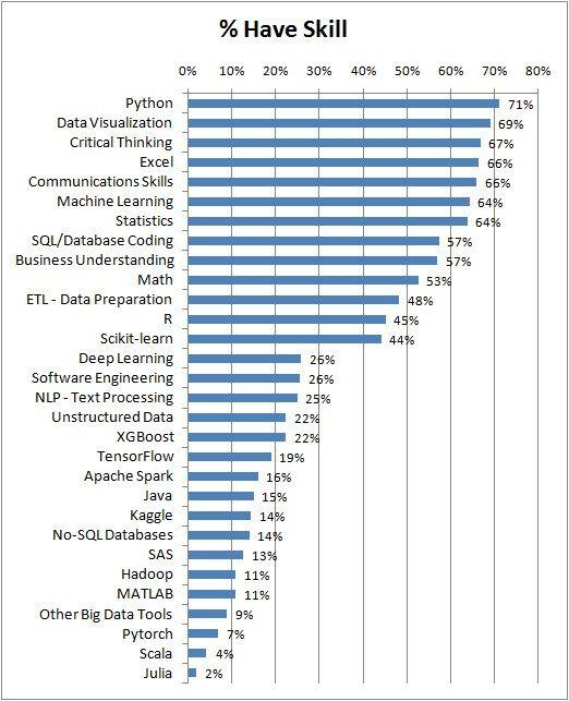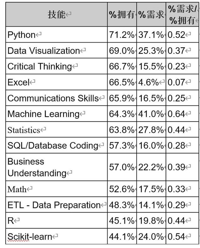 表1:核心数据科学技能,按拥有技能的百分比递减排列