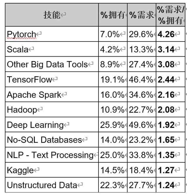 表2:热门/新兴数据科学技能,按需求技能/拥有技能的百分比递减排列