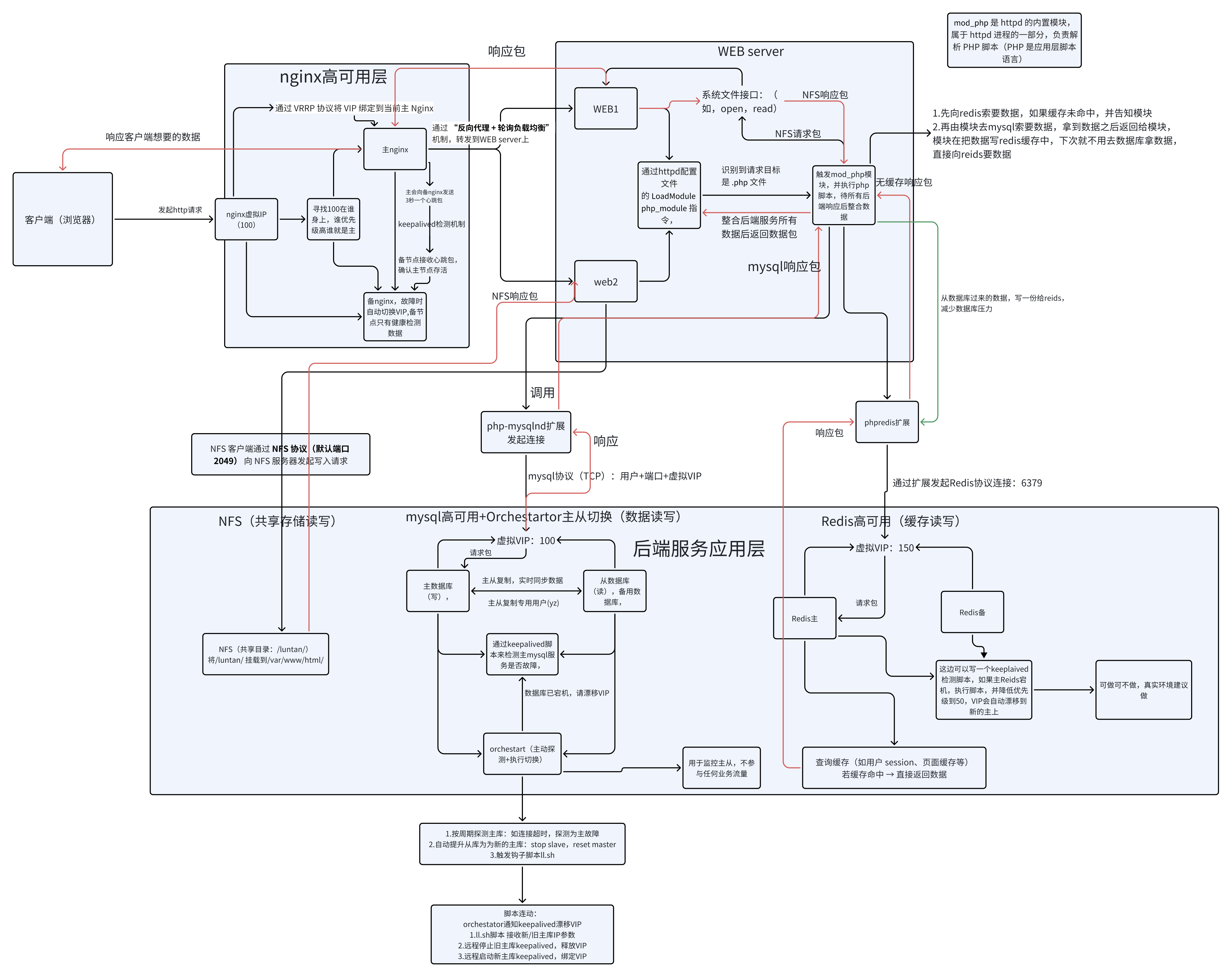 本文详细介绍了基于LAMP架构的高可用网站集群部署方案,采用2025年最新版本组件在CentOS7系统上实现。系统架构包含Nginx作为反向代理和负载均衡入口,Apache作为Web服务,MySQL主从集群配合Orchestrator实现自动故障切换,Redis提供缓存服务,NFS实现共享存储。部署过程中重点解决了版本兼容性、服务解析配置、模块加载等技术难点,并通过Keepalived实现各组件的高可用。文章提供了完整的安装配置流程和故障排查方法,最终构建了一个支持主节点故障自动切换、业务不中断的高性能网站集群。测试结果表明,当主节点故障时,系统能够自动完成VIP漂移和主从切换,确保服务持续可用。