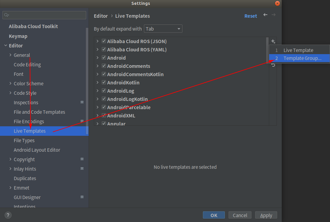 设置将模板应用于那些场景,一般选择EveryWhere-->Java即可,如果没有修改过,显示define,不然则显示为change