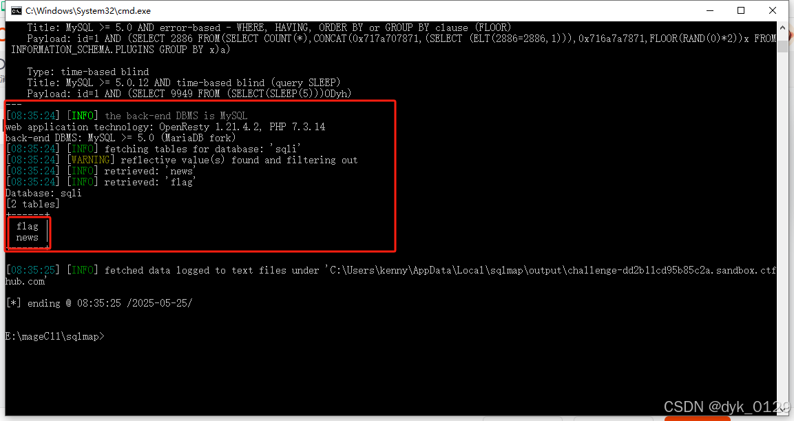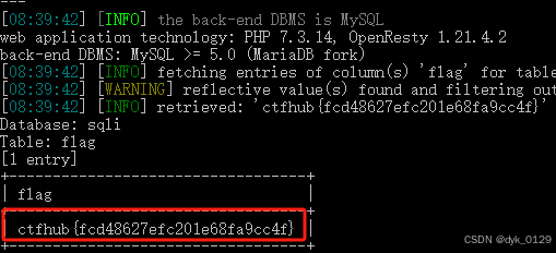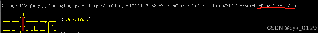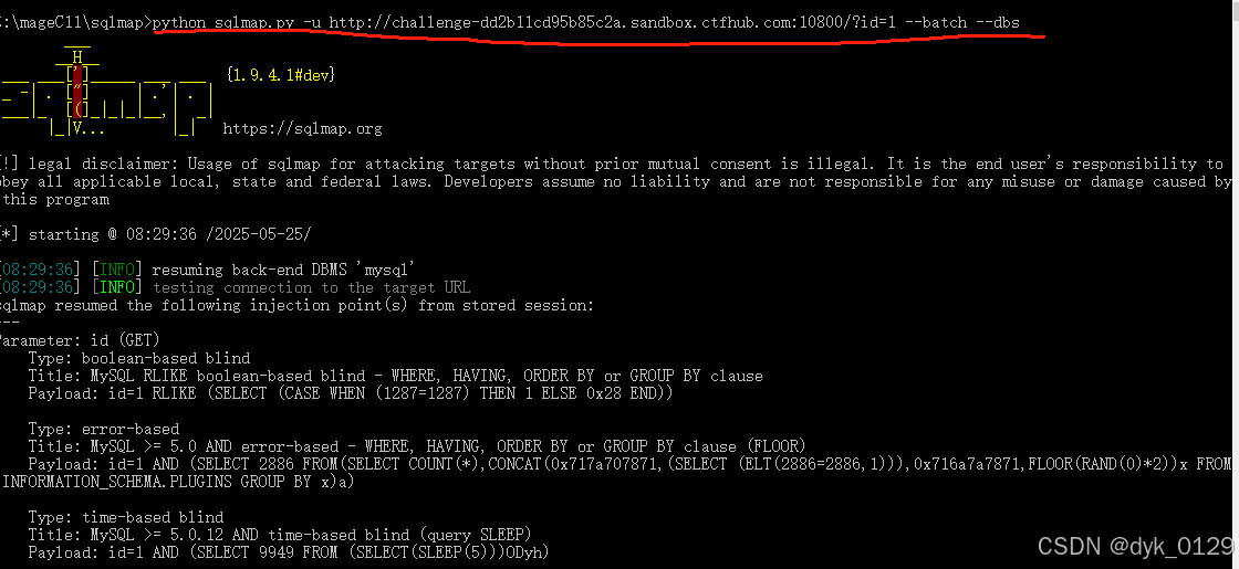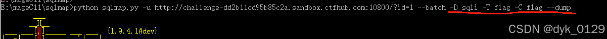- 基本命令:python sqlmap.py -u http://challenge-dd2b11cd95b85c2a.sandbox.ctfhub.com:10800/?id=1 --batch