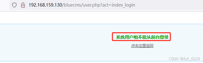 - 在用户登录模块,尝试使用admin登录,提示“系统用户组不能从前台登录”:猜测admin为后管账号
