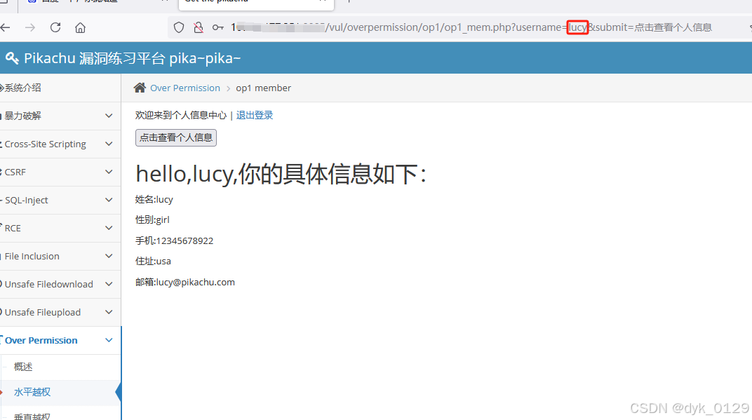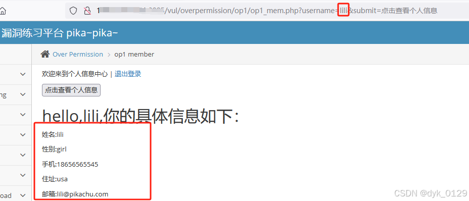 - 将url中的lucy改为lili:展示出了lili的信息,说明存在水平越权漏洞
