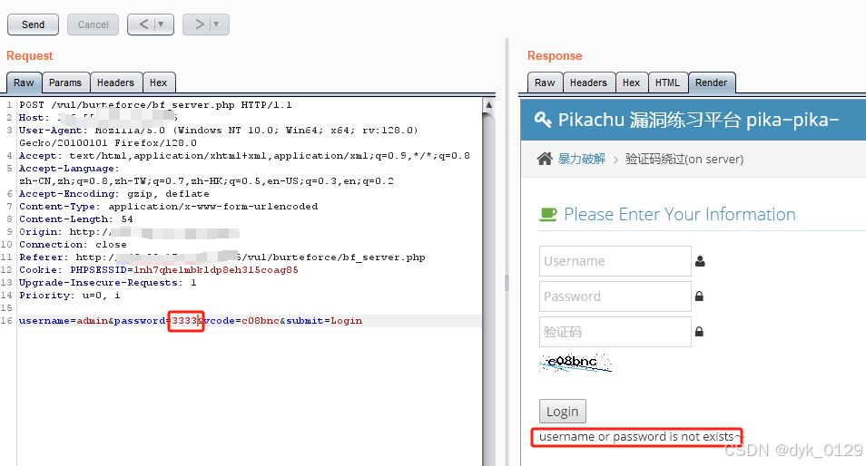 输入账密(随便输)、正确验证码,使用burp拦截,重放几次:发现没提示验证码错误
