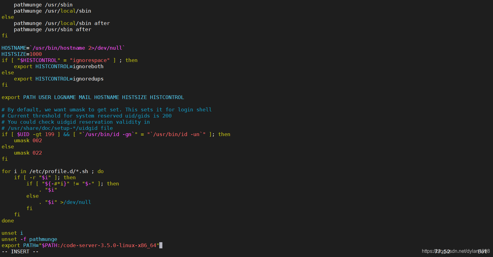 打开**/etc/profile**,将**export PATH="$PATH:/code-server-3.5.0-linux-x86_64"**添加至最后一行。