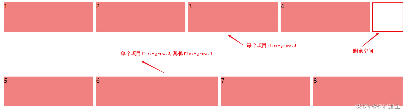 定义项目的放大比例,默认为0,即如果存在剩余空间,也不放大。如果所有项目的flex-grow属性都为1,则它们将等分剩余空间(如果有的话)。如果一个项目的flex-grow属性为2,其他项目都为1,则前者占据的剩余空间将比其他项多一倍,如果剩余空间不足一倍,则剩余空间全部有前者占满。