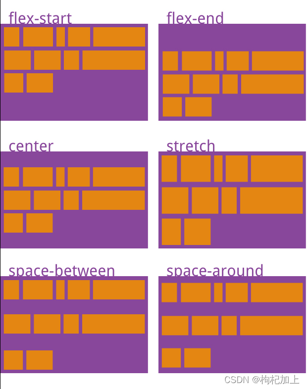 justify-content:flex-start(默认值) | flex-end | center | space-between | space-around