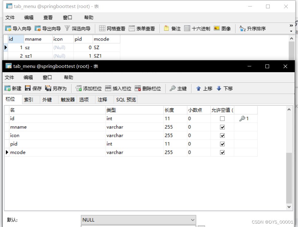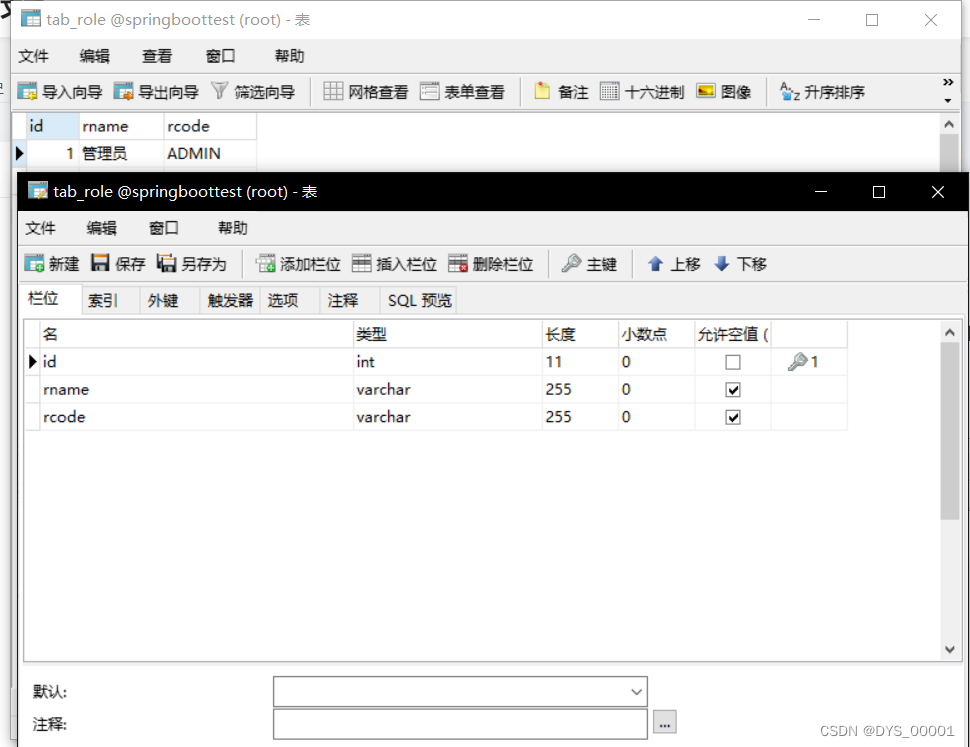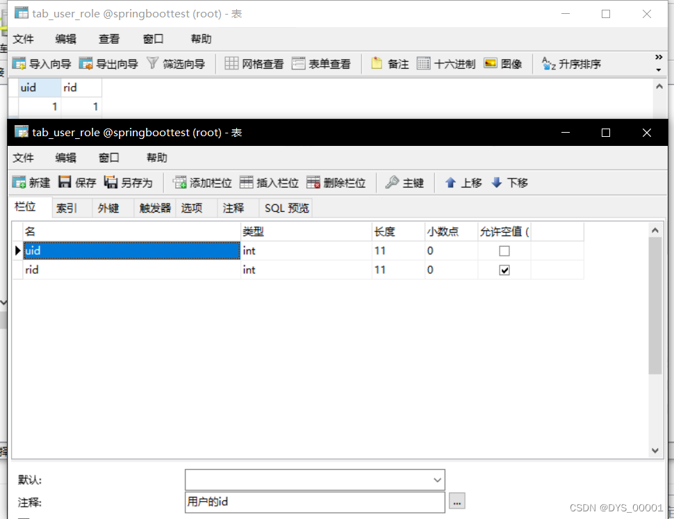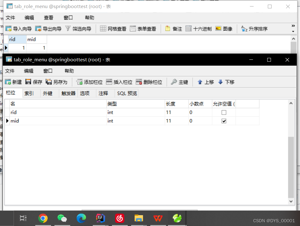 用户表 角色表 用户与角色之间的关系表 菜单表 角色和菜单之间的关系表