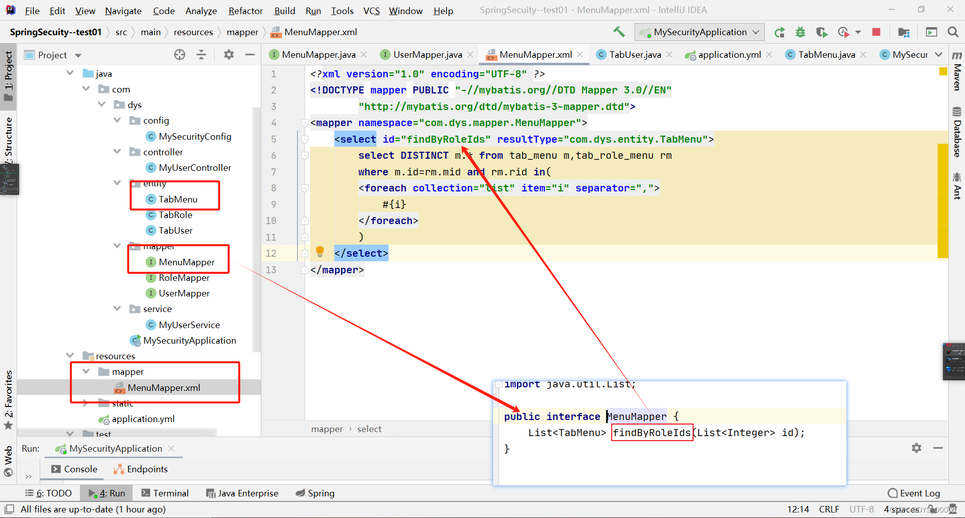 一个用户可以有多个角色 所以想要查每个角色的菜单需要接收多个id 这个相对于上面两个查询这里需要在resources里面创建.xml文件编写sql语句