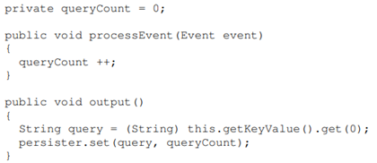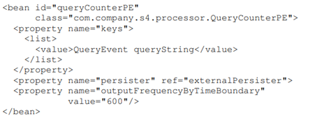 考虑一个PE订阅了用户搜索查询的事件流的例子,从开始为每个查询实例计数,并间歇性的将计数值写到一个外部存储。事件流由 QueryEvent 类型的事件组成。类 QueryCounterPE实现图二中描述的processEvent()和output()。在这个例子中,queryCount是PE的内部状态变量,负责这个PE对查询的计数。PE 的配置在图三中描述。在这里,属性 keys 告诉我们 QueryCounterPE订阅了一个 QueryEvent类型的事件,并且关注事件的 queryString 属性。配置将 PE和数据处理组件 externalPersister绑定起来,并且构造 output()方法为每 600秒调用一次。