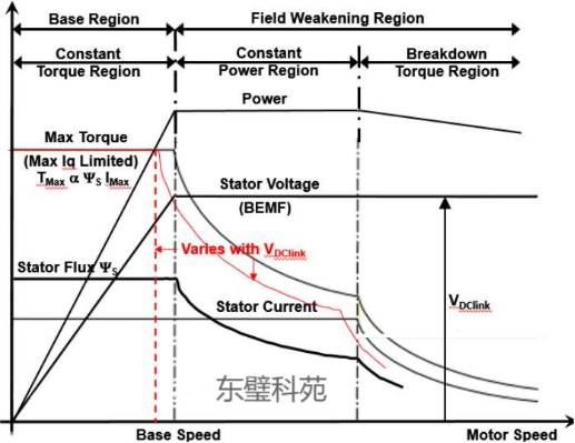 当电机高速运行时,BEMF可能接近甚至超过母线电压(即驱动器供电电压)。若BEMF ≥ 母线电压,驱动器无法提供足够电压差驱动电流,导致电流下降。当BEMF接近母线电压时,驱动器需100%占空比才能产生正向电流。但实际PWM存在死区时间(Dead Time),导致有效电压仍低于BEMF,电流持续衰减。PWM饱和后,电流控制器无法输出更高电压指令,电流反馈值持续低于目标值,扭矩随之崩溃。