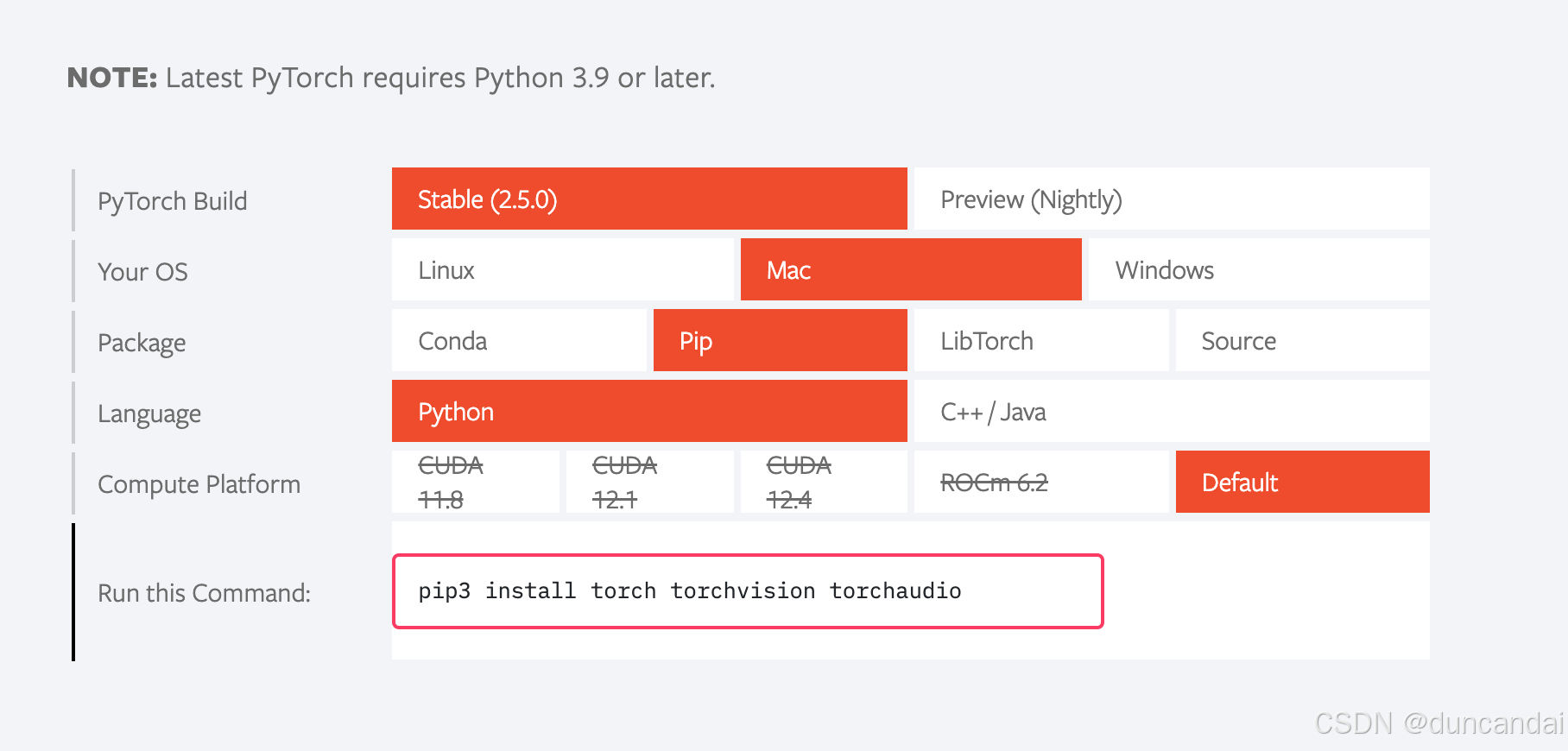 注:这里默认已经安装anaconda,所以自动带了python, pip3之类,看这里可以看到pytorch需要的python版本为3.9及以上的