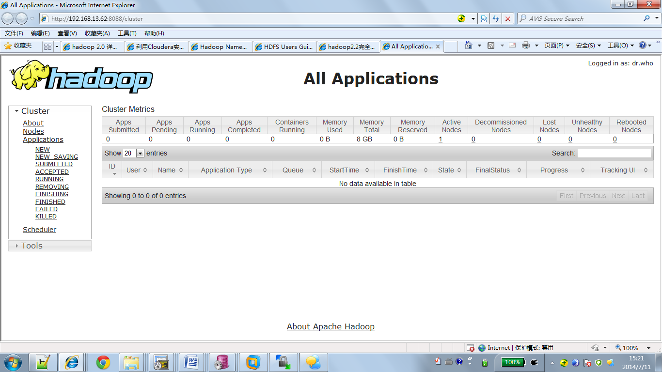 1) 输入http://192.168.13.62:8088/cluster 查看yarn是否正常部署