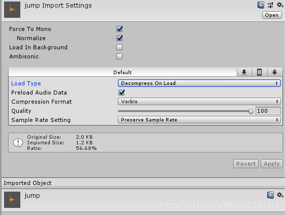 (1)对于经常播放的和短的音频剪辑,使用“Decompress On Load”和“PCM或ADPCM"压缩格式。当选择PCM时,不需要解压缩,如果音频剪辑很短,它将很快加载。你也可以使用ADPCM。它需要解压,但解压比Vorbis快得多。