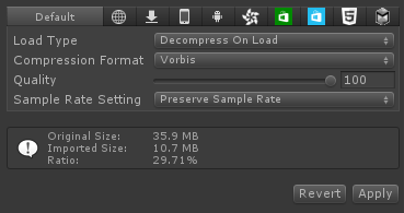 (4)对于很少播放中等大小的音频,使用”Compressed In Memory“ 和Vorbis压缩格式。这个音频可能太长,无法使用adpcm存储,播放太少,因此解压缩所需的额外CPU电量不会太多。