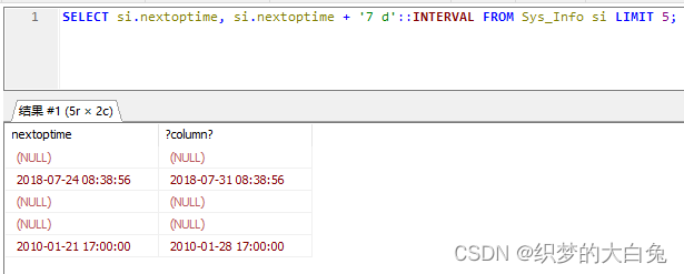 SELECT si.nextoptime, si.nextoptime + '7 d'::INTERVAL FROM Sys_Info si LIMIT 5;
