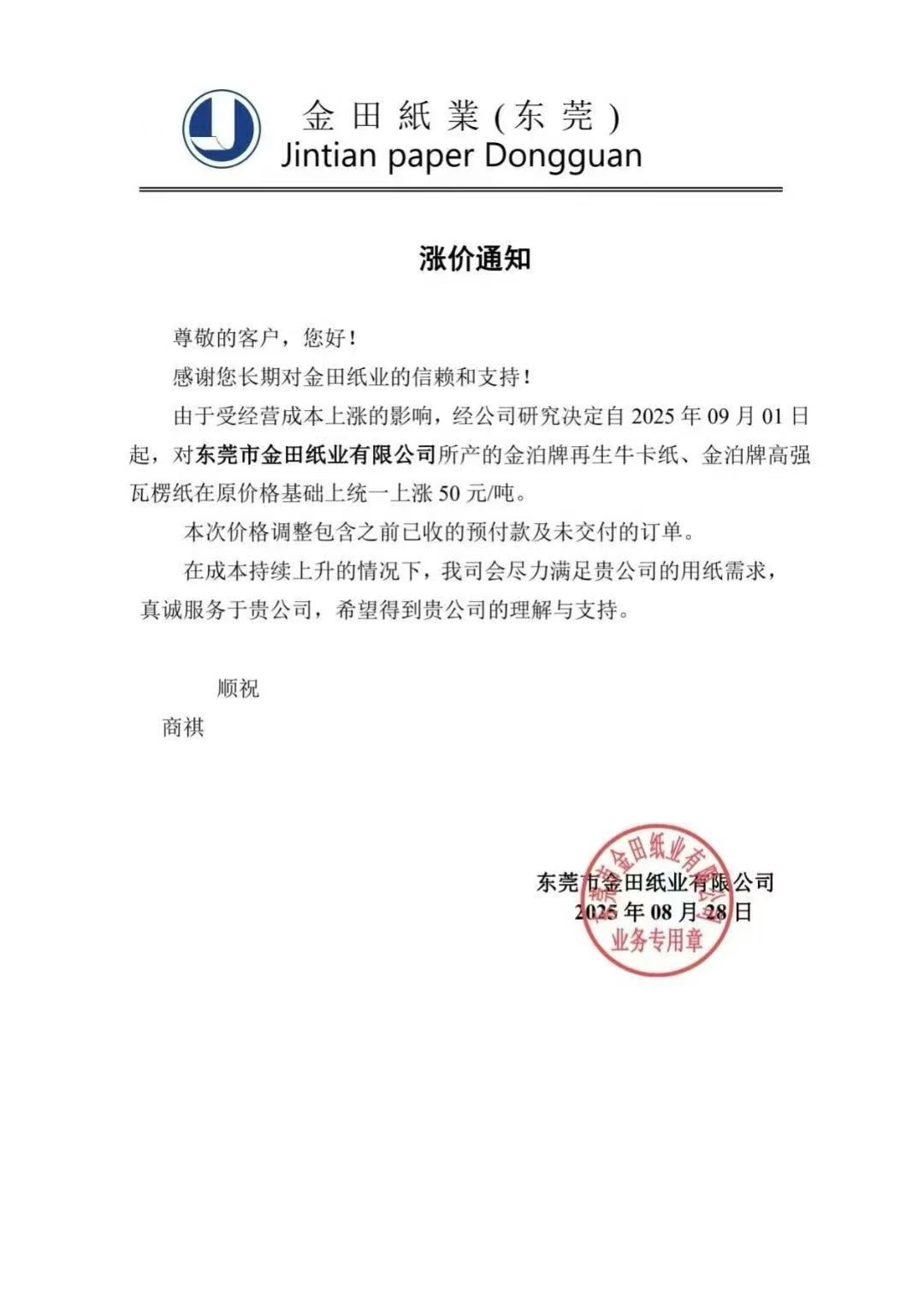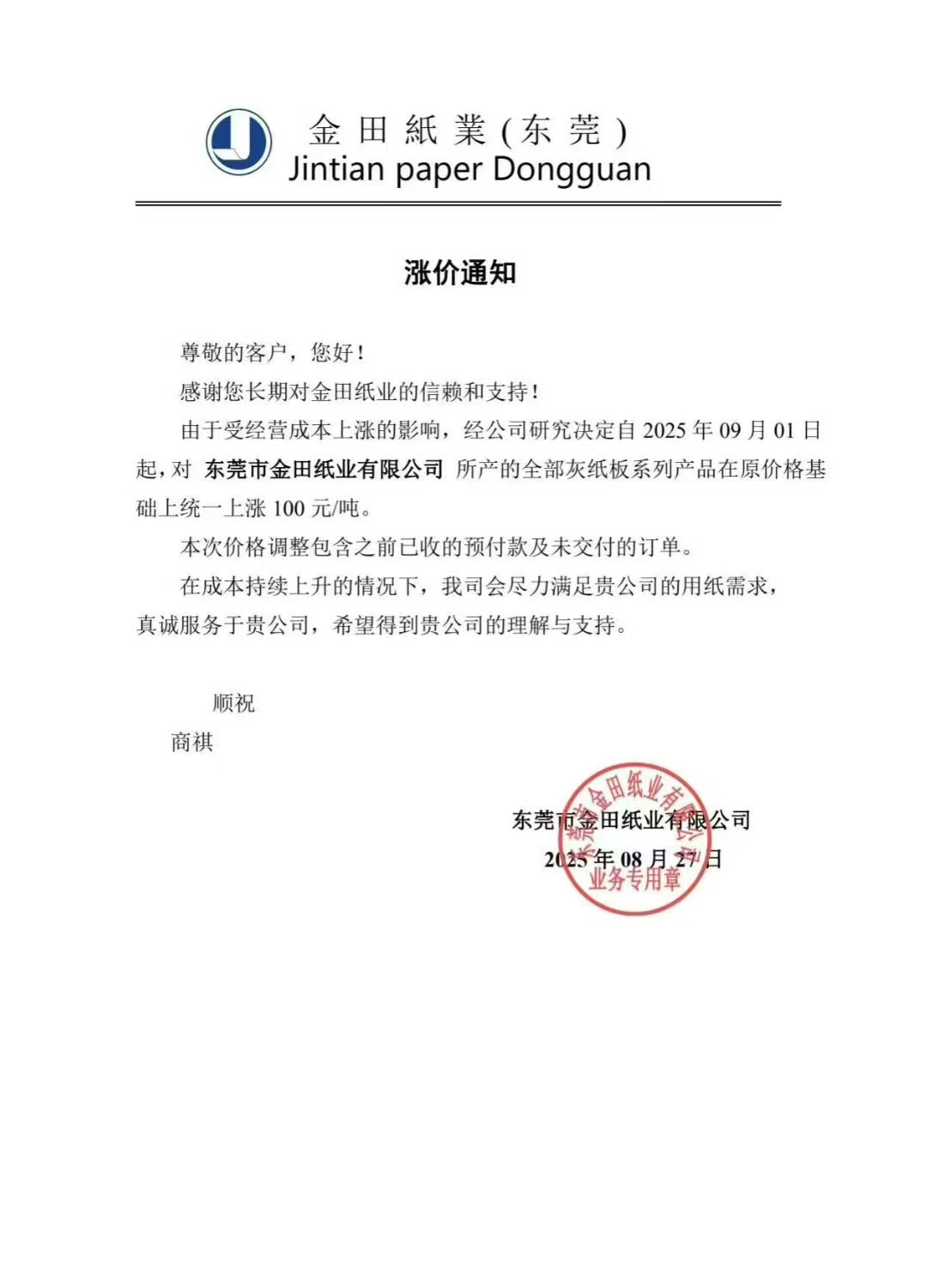 东莞市金田纸业:自2025年09月01日起,对东莞市金田纸业有限公司所产的金泊牌再生牛卡纸、金泊牌高强瓦楞纸在原价格基础上统一上涨50元/吨。自2025年09月01日起,对东莞市金田纸业有限公司所产的全部灰纸板系列产品在原价格基础上统一上涨 100元/吨。自2025年09月02日起,对东莞市金田纸业有限公司所产的金泊牌纱管原纸(H)纸在原价格基础上统一上涨 30 元/吨。