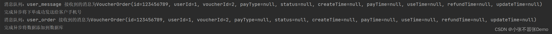 System.out.println("消息队列:user_message 接收到的消息为" + voucherOrder);