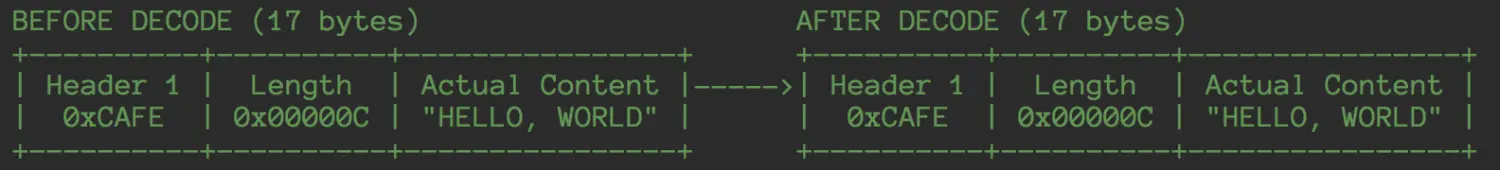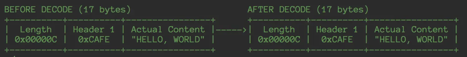 拆完之后,HDR1 丢弃,长度域丢弃,只剩下第二个header和有效包体,这种协议中,一般HDR1可以表示magicNumber,表示应用只接受以该magicNumber开头的二进制数据,rpc里面用的比较多