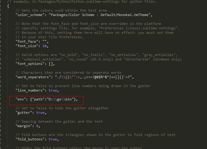 7. 修改GoSublime配置:在 Preferences菜单下,找到Package Settings,然后找到 GoSublime,再往下找到 Settings – Default。再打开的文件中,添加如下配置,并保存: