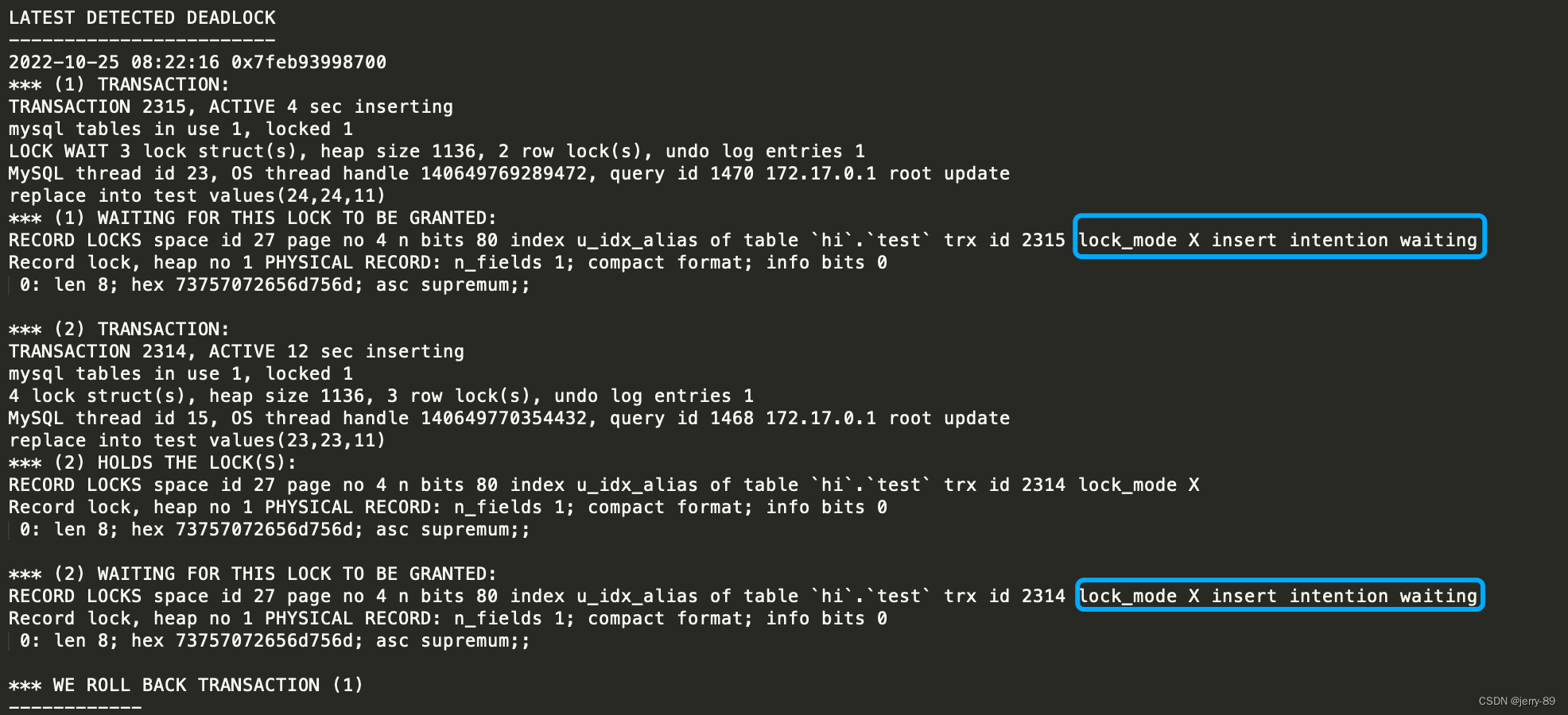 加锁分析:线程1提交后线程2的插入意向锁等待线程3的Gap,而线程3的插入意向锁等待线程2的插入意向锁,故而死锁出现。