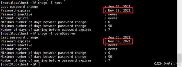 1)执行shell命令【chage -M 90 用户名】将所有用户的口令有效期改为90天