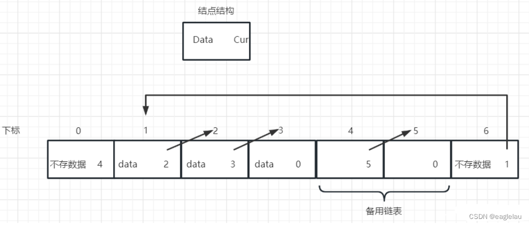 此时,为了适应这个,会存在一个“潜规则”,默认,数组第一个元素即下表为 0 的的元素的 Cur 存放备用链表的第一个结点的下标(备用链表的表头),而数组最后一个元素的 Cur 存放第一个有数值的结点的下标(数据链表的表头)。也有的把数组第二个元素(Cur 为 1)用来作为数据链表的头节点。