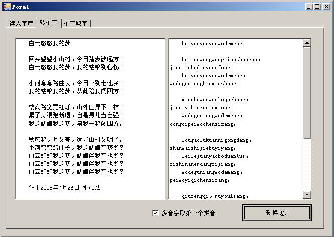 Me .RichTextBox2.Text = gPinyinService.ToPinyin( Me .RichTextBox1.Text, Me .CheckBox1.Checked, Me .CheckBox2.Checked)