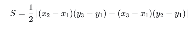 // 面积 = |(x2-x1)(y3-y1) - (x3-x1)(y2-y1)| / 2