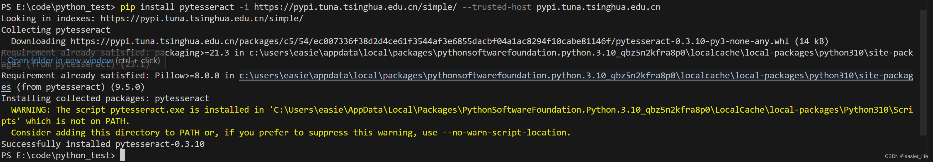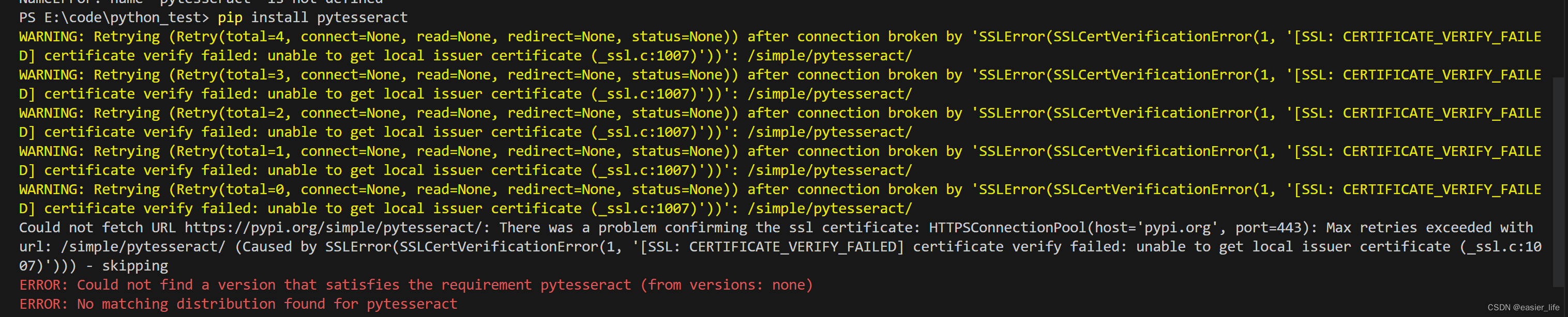 博主安装pytesseract时遇到报错问题,网上搜到的前两种方案均失败,使用第三种方案成功解决。该方案为使用pip命令安装cnocr,可指定清华镜像源,还可添加信任主机。