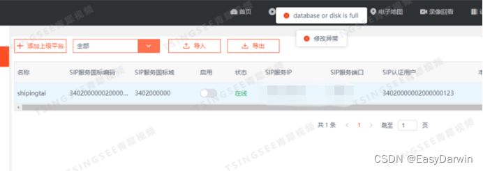 随着视频监控技术的不断发展,EasyCVR国标视频综合管理平台作为智慧物联应用平台,在安防行业中扮演着重要的角色。然而,最近一位用户在使用EasyCVR平台时遇到了一个问题:在修改参数配置后,系统提示报错信息“database or disk is full”。因此,用户请求我们的技术人员协助解决这个问题。