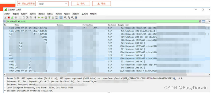 4)在对上级平台的加密算法进行兼容后,重新进行注册请求。此时再次抓包查看,发现视频汇聚平台已经成功上线。