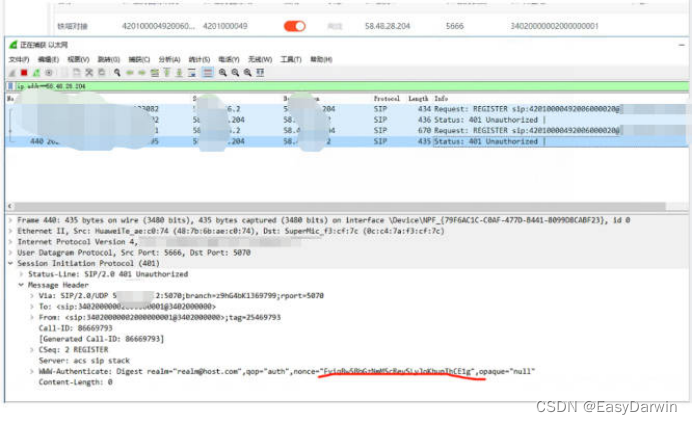 1)首先进行网络抓包分析,获取报文信息。当EasyCVR平台发送注册请求时,上级平台回复401错误并要求进行鉴权校验。EasyCVR平台再次发送注册请求,并携带上一次回复中的鉴权信息,但上级平台仍然返回401错误。这种情况表明双方的密码解析方式不一致。