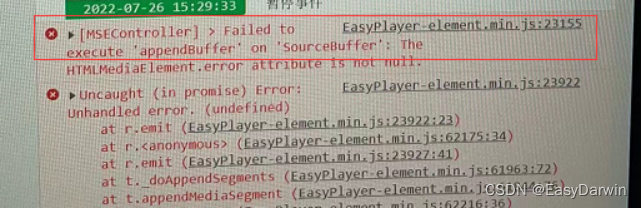 我们在控制台中发现播放器出现了"SourceBuffer"错误,这种错误通常是由于视频流异常导致播放器无法解码。
