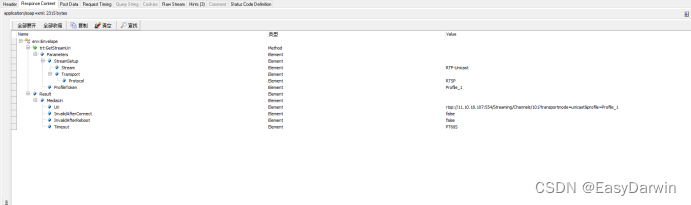上图为onvif device manager的抓包结果。要解决此问题,我们只需在EasyCVR中将101字段改为1即可正常获取流地址。参考代码如下: