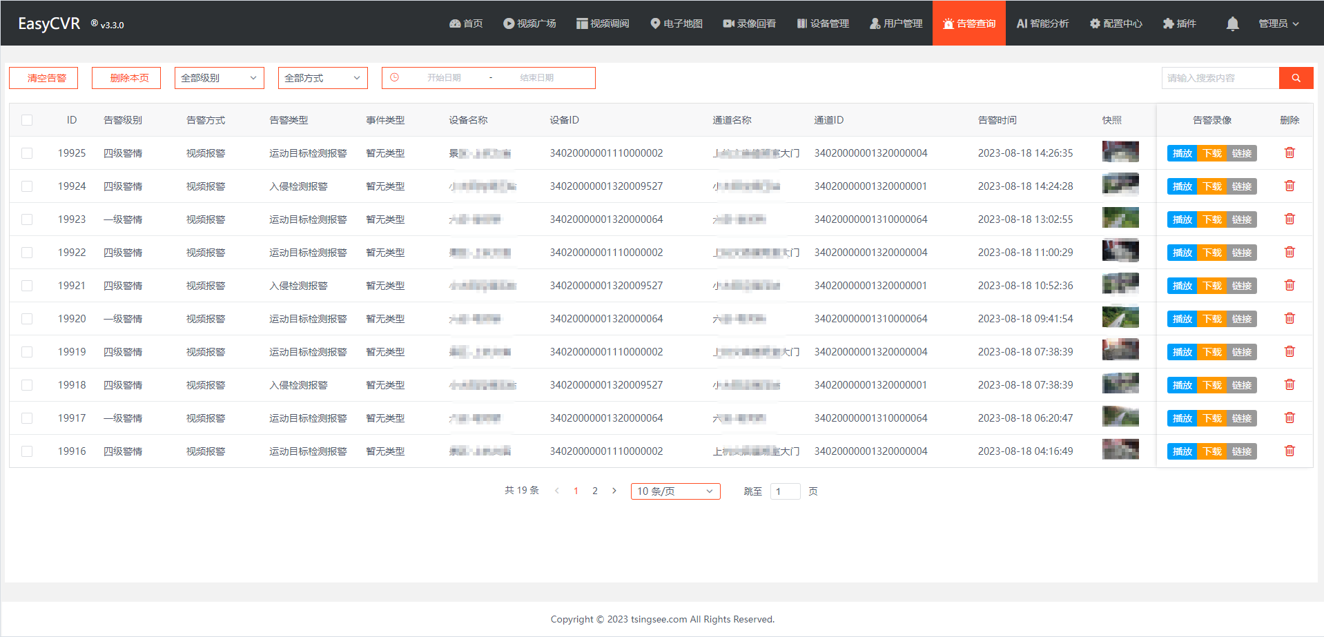 EasyCVR是一款智能视频监控平台,具备视频云存储和集中存储功能。它能够在复杂的网络环境下,实现海量设备的集中统一接入和汇聚管理,同时提供视频处理与分发、录像与存储、按需调阅、平台级联等功能。安防视频监控平台EasyCVR能够对前端接入设备进行统一集中管理,并支持设备树分组和分级管理。用户可以通过设备树来组织管理设备,同时支持实时监测设备状态和云端运维等功能,实现对接入资源的集中控制和权限分配。如果您对EasyCVR感兴趣,可以前往演示平台进行体验,也可以进行部署和测试。我们提供了相应的演示平台和文档供用户使用。