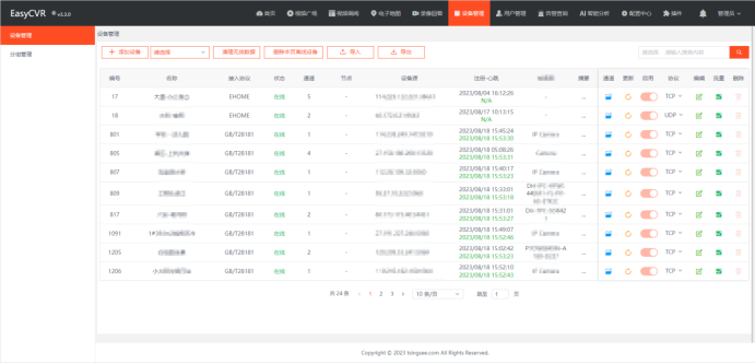 1、开放兼容性:该平台支持多种主流标准协议和厂家私有协议与SDK接入,包括GB28181、RTSP/Onvif、RTMP等,可实现对各种摄像机的综合管理。同时支持AI智能分析网关的结合,融合了边缘AI智能识别技术,如人脸识别、车辆识别、人员入侵告警、烟火检测等。