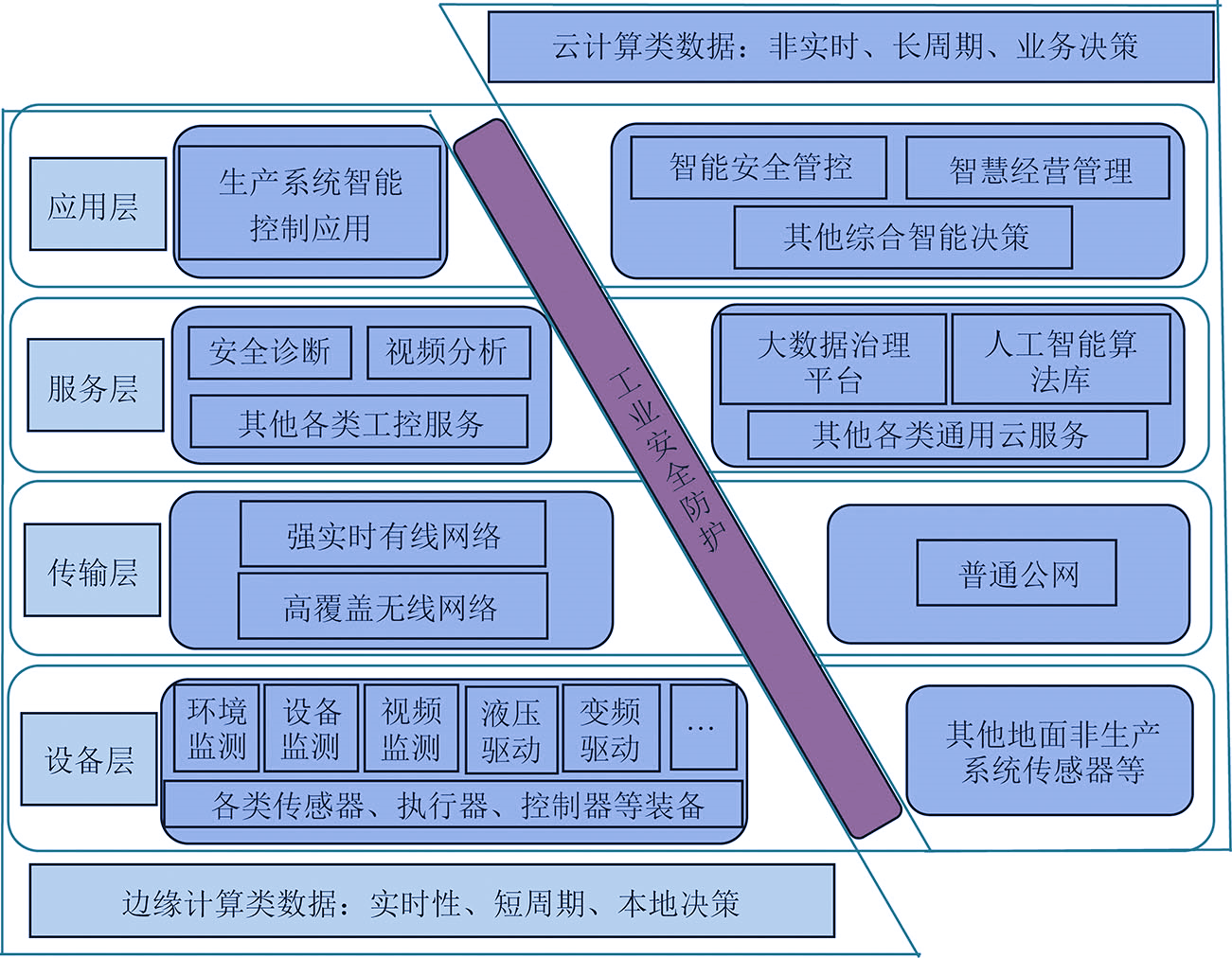 2、生产执行业务域则聚焦于智能工作面、智能掘进工作面以及智能主、辅运输系统等生产过程,遵循“集中管理、分散控制”的原则,构建了集采集、处理、控制、协调与综合智能判断于一体的综合自动化控制系统,实现了生产过程的智能化管理。