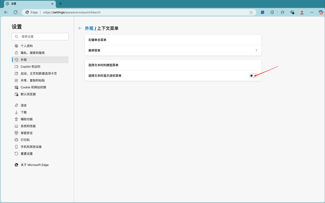 为啥要关?因为 Microsoft Edge 的迷你菜单可能会和 SmartCopy 的自动复制 “打架”,关了之后,选中文字直接复制,丝滑得像喝了杯奶茶!