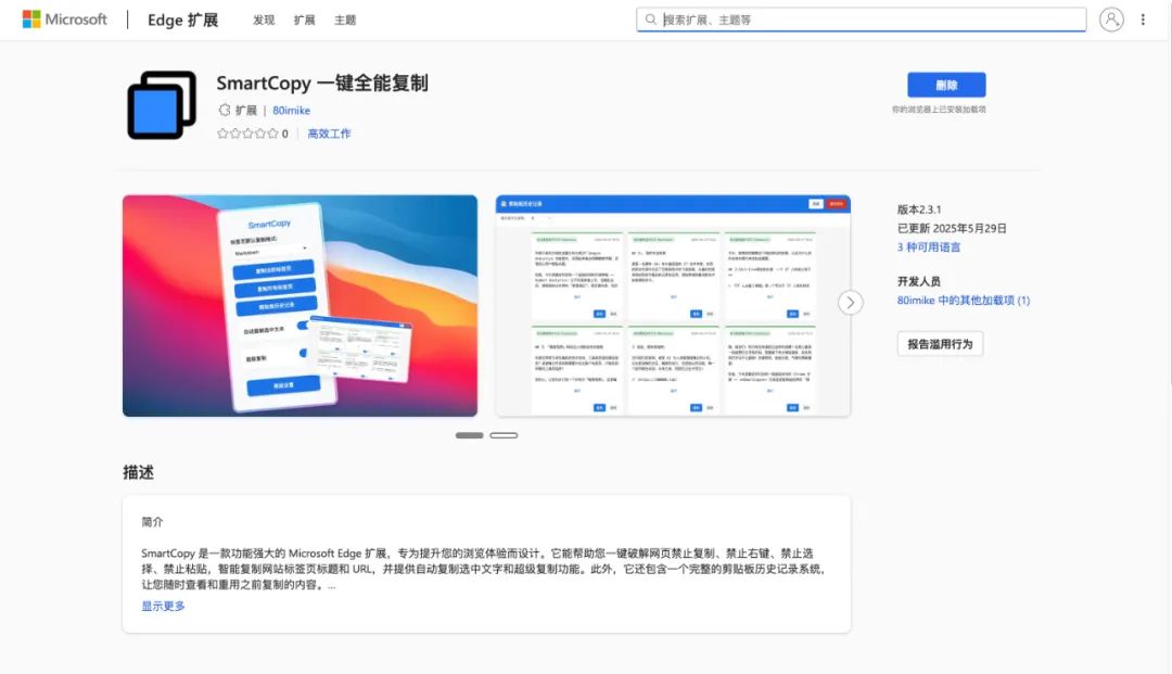SmartCopy 登陆 Microsoft Edge 应用商店,绝对是效率党的大喜事!从破解复制限制到智能转 Markdown,从自动复制到剪贴板历史,这款神器让你的浏览体验直接开挂!装上它,中文界面亲切到爆,英文界面酷炫到飞,复制粘贴快到炸,连老板都得夸你 “效率超人”!
