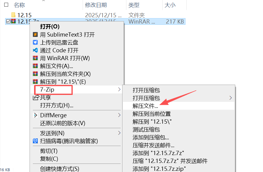 右击需要解压的文件,点击7-Zip,选择解压文件,即可将该文件解压至当前文件夹。
