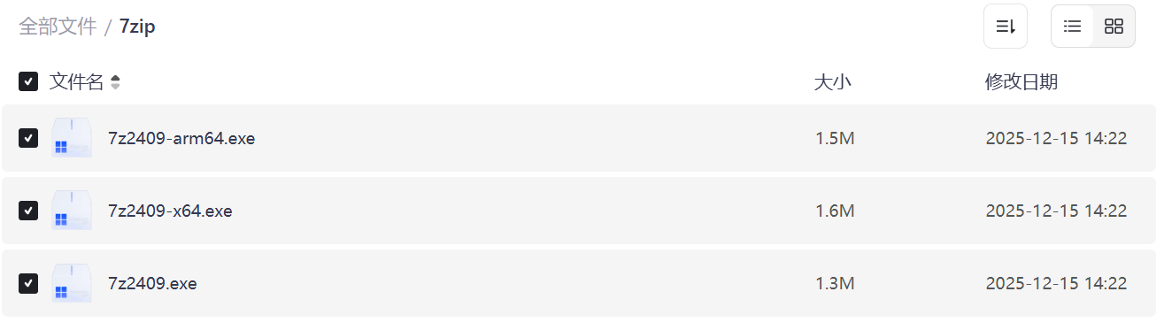 - 7z2409-arm64.exe:适配 ARM64 架构,仅用于搭载 ARM 芯片的 Windows 设备,比如 Surface Pro X 等,普通 x86/x64 电脑无法安装。