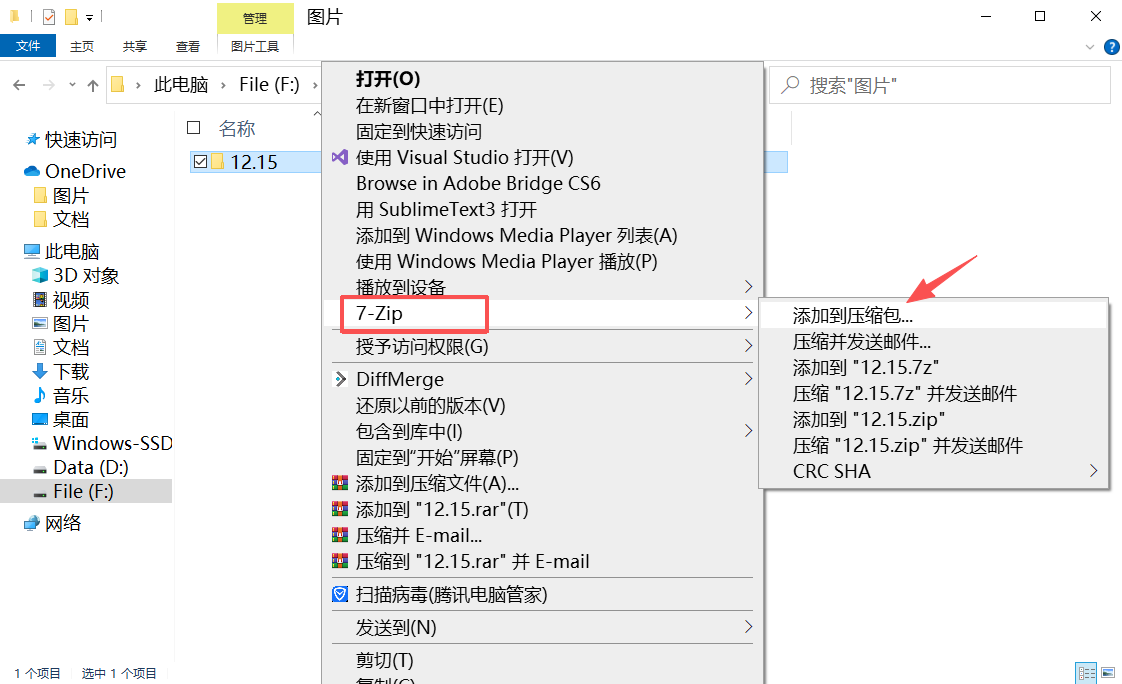 右击需要压缩的文件,点击7-Zip,选择添加到压缩包,即可将该文件压缩至当前文件夹。