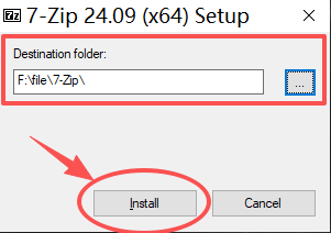 1)点击 7z2409-x64.exe 启动安装,会弹出下图所示窗口,默认安装到C盘,这里强烈建议手动修改到其他盘(非系统盘),确定安装路径后,点击 Install 按钮: